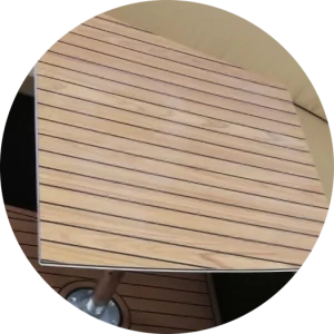 Produkt o nazwie CoolDeck: syntetyczna, elastyczna posadzka z żywicy poliuretanowej, zaprojektowana jako pokład imitujący drewno tekowe, z technologią obniżającą temperaturę powierzchni.