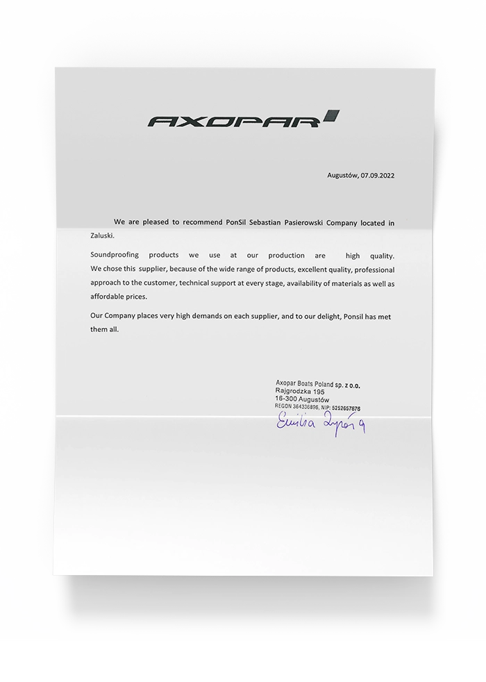 Odkryj pełnię spokoju z naszymi materiałami wygłuszającymi od elastycznych pianek po zaawansowane kompozyty akustyczne. PonSil to gwarancja skutecznej izolacji akustycznej i termicznej, która chroni przed hałasem, drganiami i utratą ciepła niezależnie od warunków. Nasze rozwiązania znalazły zastosowanie w budownictwie, motoryzacji, stoczniach i przemyśle, oferując trwałość, bezpieczeństwo i komfort użytkowania przez lata.